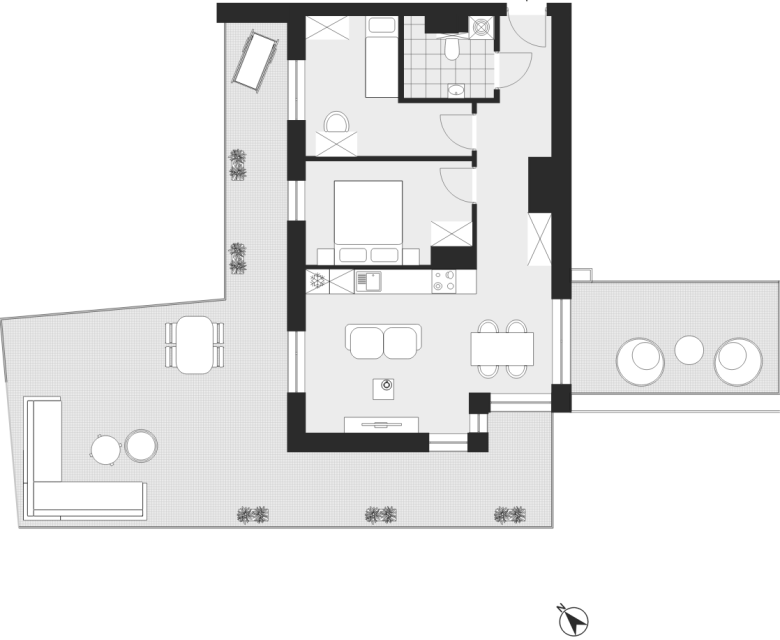 - Powierzchnia dodatkowa: balkon (57,9 m²), taras (13,2 m²), komórka lokatorska
